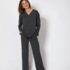 The soft & warm women’s pajama includes a gently fitted long-sleeve top and full-length pants with an elastic waistband. The silhouette is relaxed but still polished—ideal for wearing around the house while feeling put together.