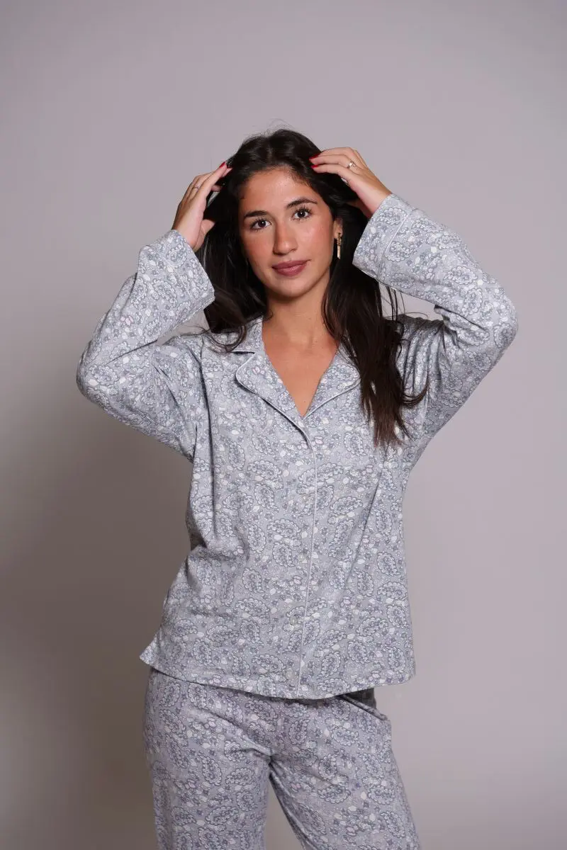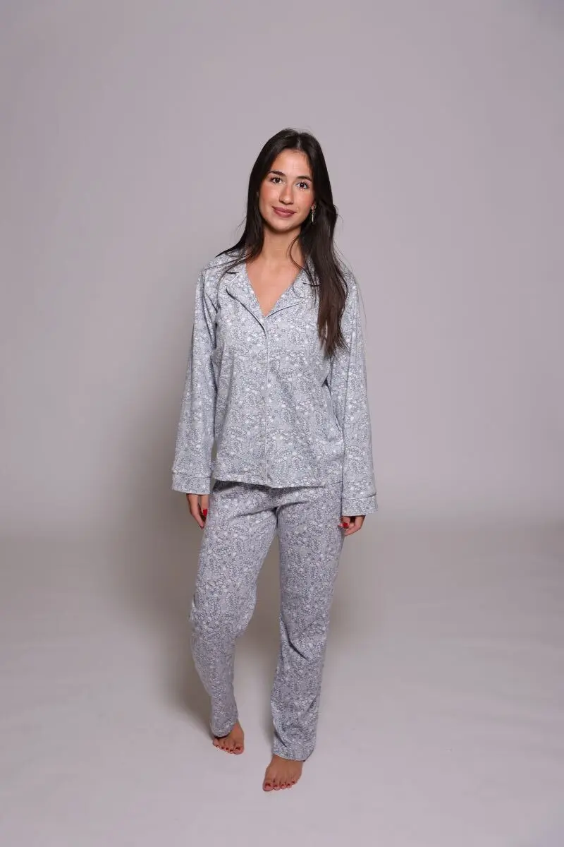 This pyjama set features a timeless button-up top with a flattering fit and relaxed bottoms for ease of wear. The elegant design strikes the perfect balance between casual and chic.