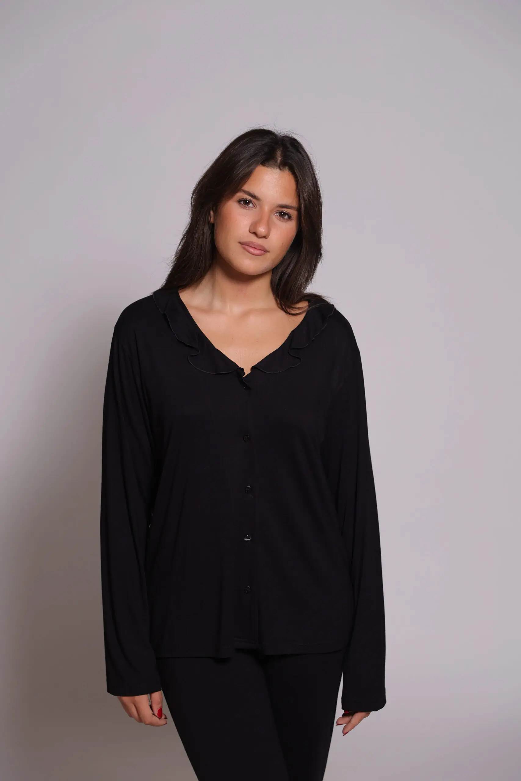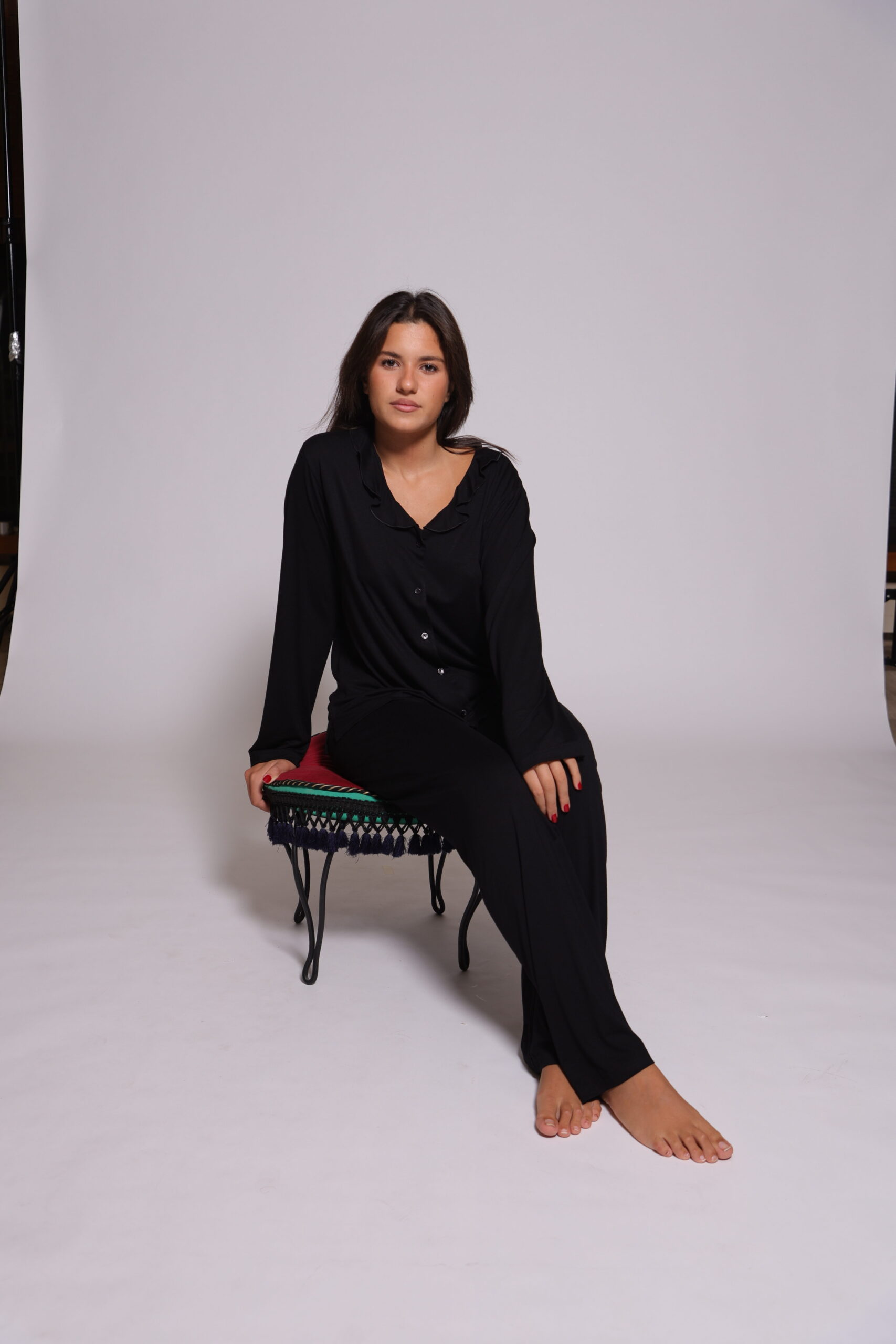 This pyjama set features a timeless button-up top with a flattering fit and relaxed bottoms for ease of wear. The elegant design strikes the perfect balance between casual and chic.