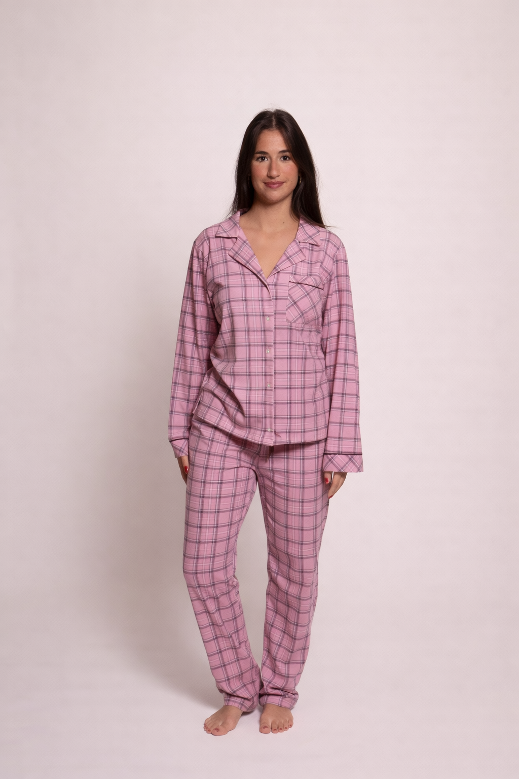This pyjama set features a timeless button-up top with a flattering fit and relaxed bottoms for ease of wear. The elegant design strikes the perfect balance between casual and chic.